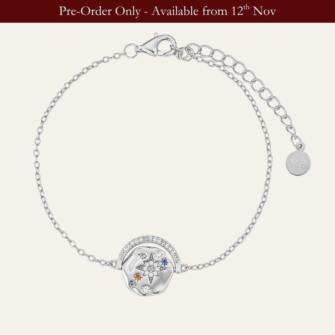 The My Sun, Moon & Stars Bracelet is the perfect companion to our beloved best-selling necklace. It’s a timeless reminder that you deserve the sun, the moon, and the stars and should never settle for less. Inspired by the warmth of the sun, the guidance of the moon, and the resilience of the stars, this piece is a talisman of inner strength. The flat, jagged-edged coin pendant is intricately detailed with celestial symbols, embodying beauty, hope, and personal empowerment.
