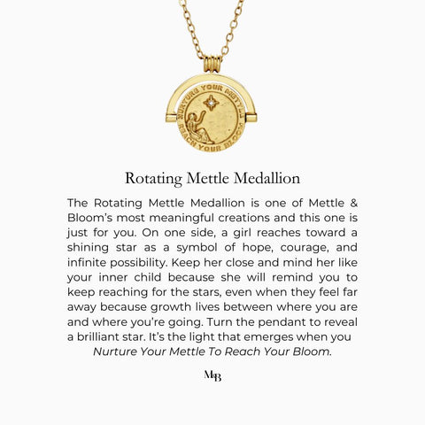 The Rotating Mettle Medallion is one of Mettle & Bloom’s most meaningful creations. It's a tactile, symbolic piece designed to ground and inspire. With its bold, spinning design, this necklace invites you to pause, reflect, and find calm in motion.