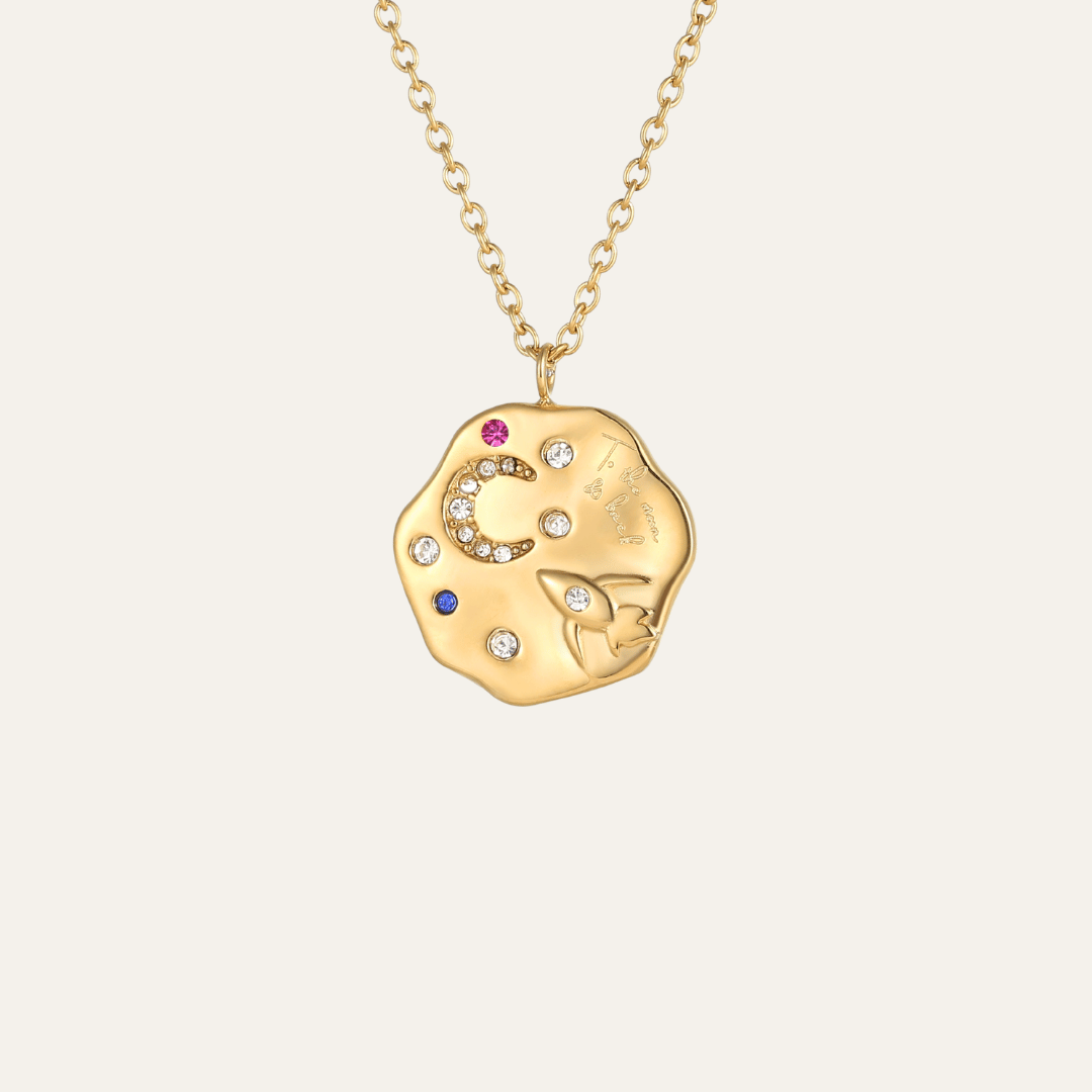 I Bought this for my french friend, Agnes, who has been lodging with us since 2017 ( she is family now really!) . I wanted a special piece that would mean something to us all as she has just been told she is terminally ill and will die. She has had to return to France reluctantly and i wanted her to take a piece of us home with her. She has worn it since we gave it to her and i can see she loves it. It is exactly what she needed as it shows the rocket heading to the moon and the inscription is "to the moon and back".