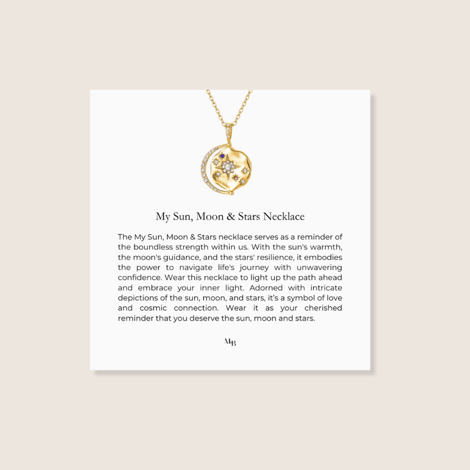 With the sun’s warmth, the moon’s guidance, and the stars’ resilience, this necklace is a cosmic talisman, reminding you of the infinite light within. Wear it as a symbol of boundless love, cosmic connection, and limitless possibility, this necklace is your reminder to never settle because you deserve the sun, the moon, and the stars.