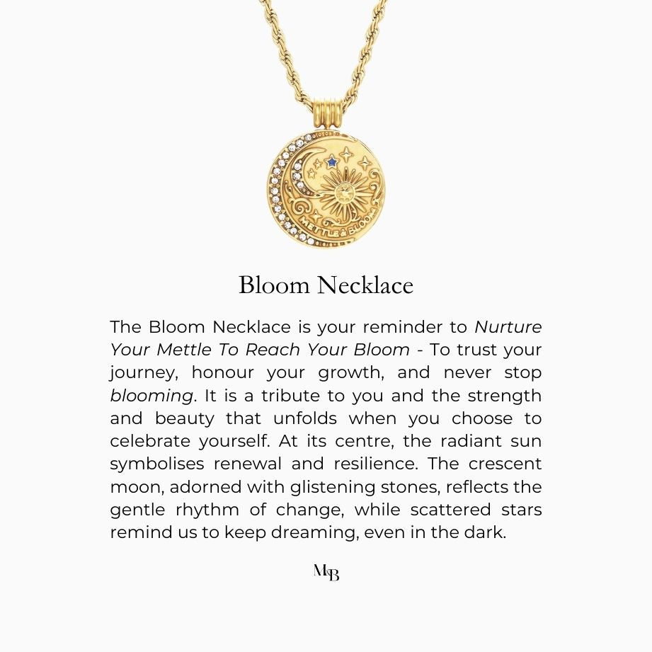 The Bloom Necklace is a powerful emblem of the Mettle & Bloom ethos - Nurture Your Mettle To Reach Your Bloom. Designed for those embracing their strength, growth, and resilience, this piece carries both substance and meaning. At its heart lies a radiant sun, symbolising growth and renewal, encircled by a crescent moon adorned with shimmering stones that catch the light like stars in motion. Tiny celestial motifs - stars and constellations - dance across the surface, telling a story of dreams, courage, and endless possibility.