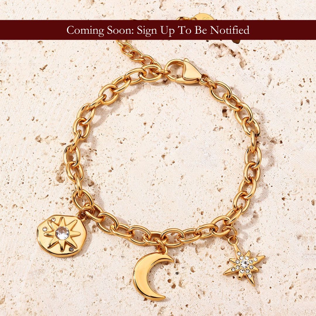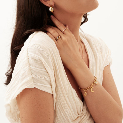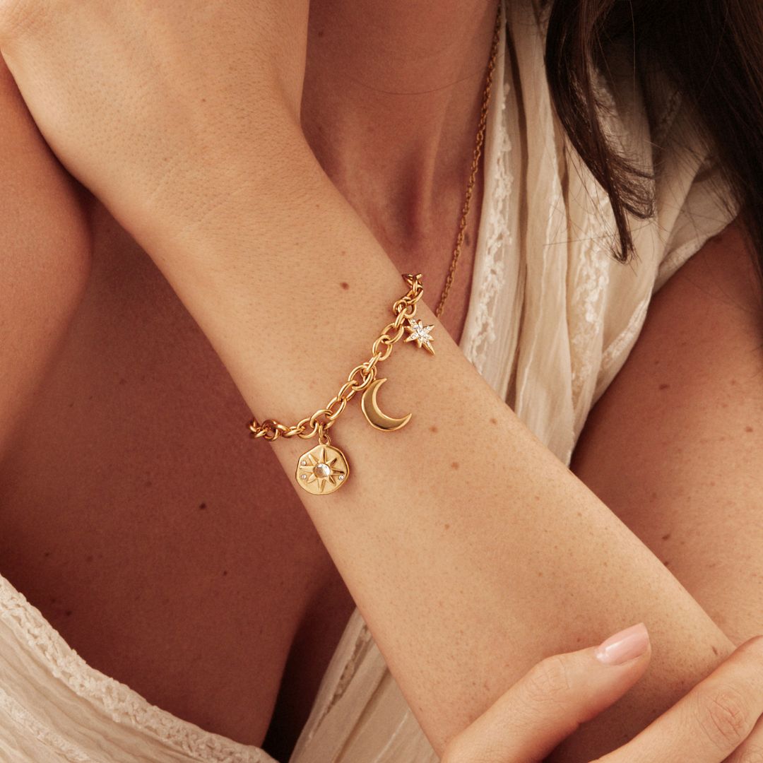 Inspired by our beloved best-seller, the My Sun, Moon & Stars Charm Bracelet captures the magic of connection and reminds us that we deserve the sun, moon and the stars. Each charm tells its own story: the sun for strength and warmth, the moon for intuition and change, and the star for hope and guidance. Together, they symbolise the balance between light and darkness and courage and calm. Suspended from a gold bracelet, each charm moves with you, catching the light with every gesture.